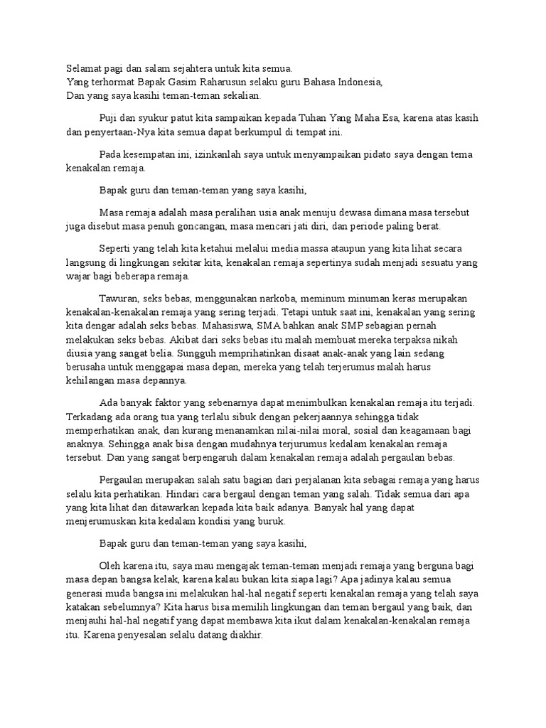Contoh teks pidato dengan tema pergaulan remaja. Contoh pidato singkat bahasa indonesia, pendidikan berkarakter, islami, lingkungan sekolah, pergaulan bebas, bahasa inggris, perpisahan, dll. Contoh pidato singkat tentang pergaulan bebas. Kesaksian mantan anak kedokteran yang terjebak pergaulan bebas,dan tuhan pulihkan.
