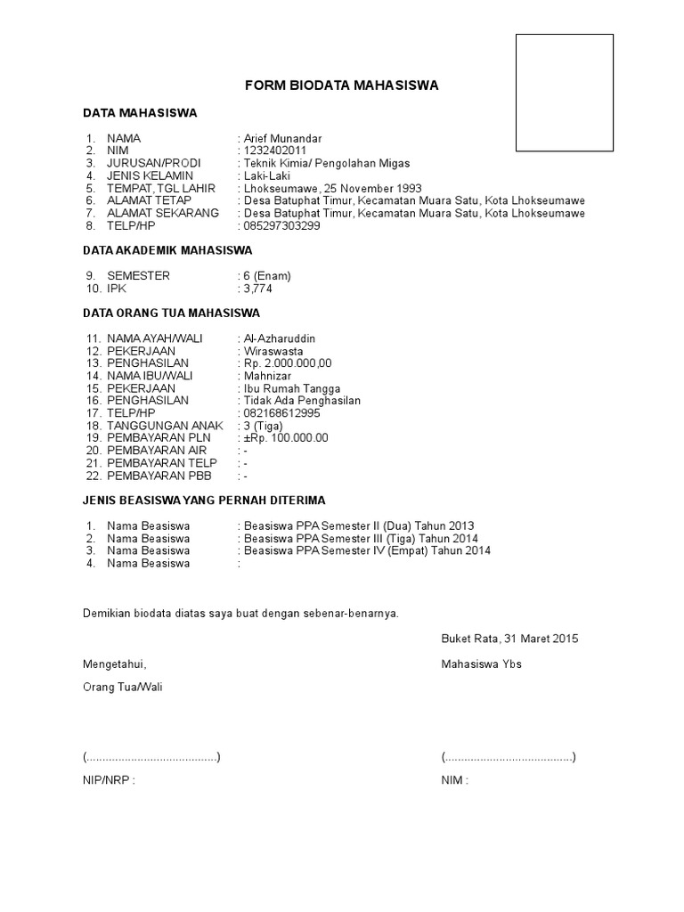 Format biodata siswa lengkap doc merupakan berkas yang digunakan untuk pendataan biodata siswa sd, smp, sma secara detail guna keperluan yang berhubungan dengan identitas siswa secara. Contoh biodata dengan format yang benar. Tempat ta'aruf di rumah ta'aruf myquran ini :