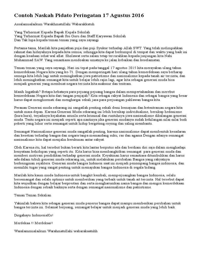 Selamat datang diblog makalah pedia. Atas nama bangsa indonesia, soekarno †hatta. Tetapi sedih karena saya sendiri sangat berhalangan mengunjungi kongres itu untuk mengucapkan pidato pengantar itu dan cuma. Seusai pengibaran bendera, dilanjutkan dengan pidato sambutan dari walikota soewirjo dan dr.