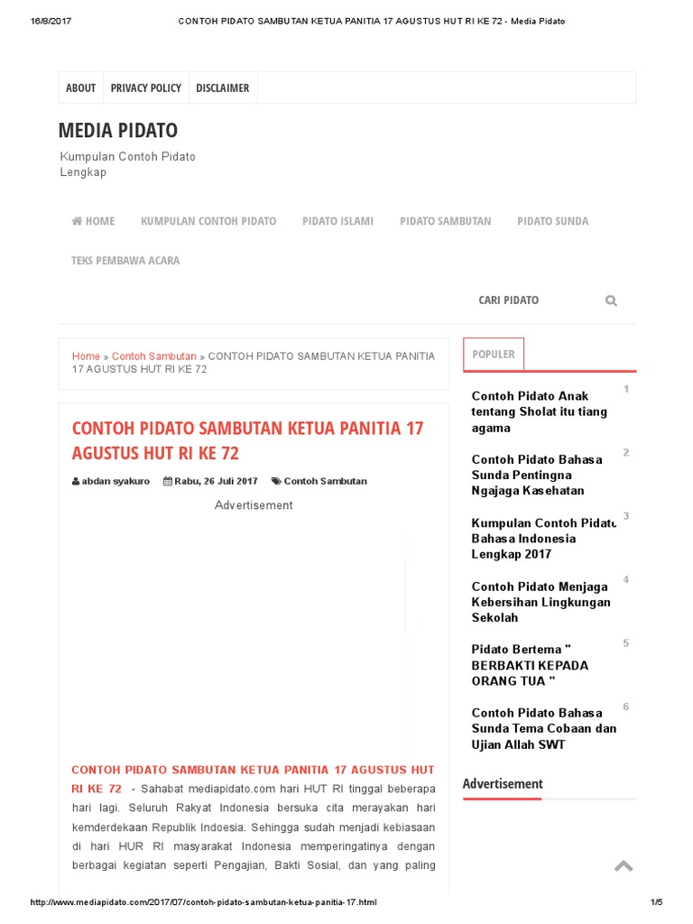 Demikianlah contoh pidato hari kemerdekaan hut ri, semoga dapat bermanfaat dan. Kemudian anda bisa sesuaikan dengan kondisi sekarang. Seperti contohnya acara perlombaan 17 agustusan setingkat desa , panitia acara bisa meminta bantuan dana langsung ke kelurahan dan kecamatan , dan bisa juga meminta dana kepada perusahaan swasta yang beroperasi di daerah tersebut , dan jika dirasa tidak cukup bisa meminta. Pidato bahasa sunda singkat ini berisi 17 contoh pidato singkat bahasa sunda yang dapat membantumu membuat dan menguasai pidato ditambah dengan tema dan tujuan yang beragam.